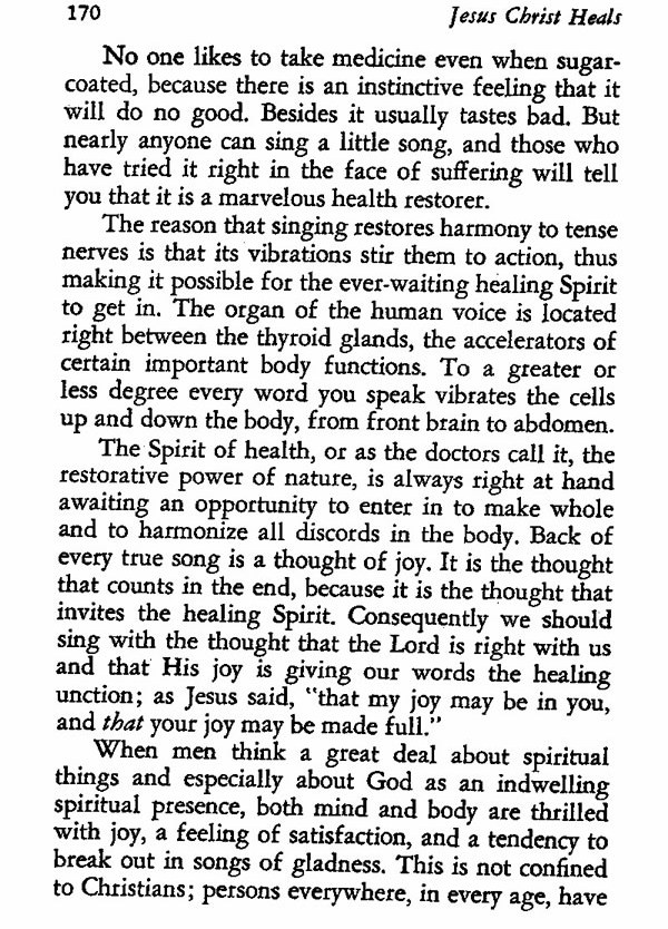 The reason that singing restores harmony to tense nerves is that its vibrations stir them to action, thus making it possible for the ever-waiting healing Spirit to get in. The organ of the human voice is located right between the thyroid glands, the accelerators of certain important body functions. To a greater or less degree every word you speak vibrates the cells up and down the body, from front brain to abdomen.