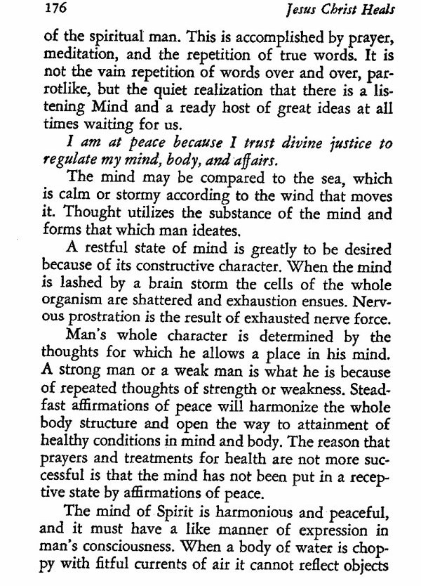Man's whole character is determined by the thoughts for which he allows a place in his mind. A strong man or a weak man is what he is because of repeated thoughts of strength or weakness. Steadfast affirmations of peace will harmonize the whole body structure and open the way to attainment of healthy conditions in mind and body. The reason that prayers and treatments for health are not more successful is that the mind has not been put in a receptive state by affirmations of peace.