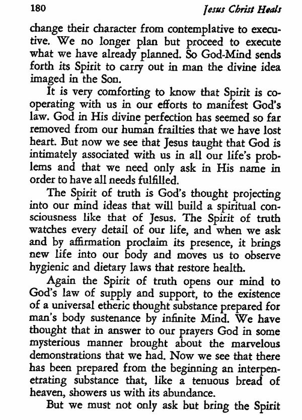 The Spirit of truth is God's thought projecting into our minds ideas that will build a spiritual consciousness like that of Jesus. The Spirit of truth watches every detail of our lives, and when we ask and by affirmation proclaim its presence, it brings new life into our bodies.