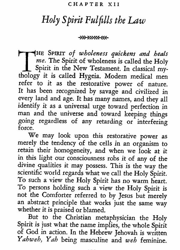 THE SPIRIT of wholeness quickens and heals me. The Spirit of wholeness is called the Holy Spirit in the New Testament. In classical mythology it is called Hygeia. Modern medical men refer to it as the restorative power of nature. It has been recognized by savage and civilized in every land and age. It has many names, and they all identify it as a universal urge toward perfection in man and the universe and toward keeping things going regardless of any interfering force.