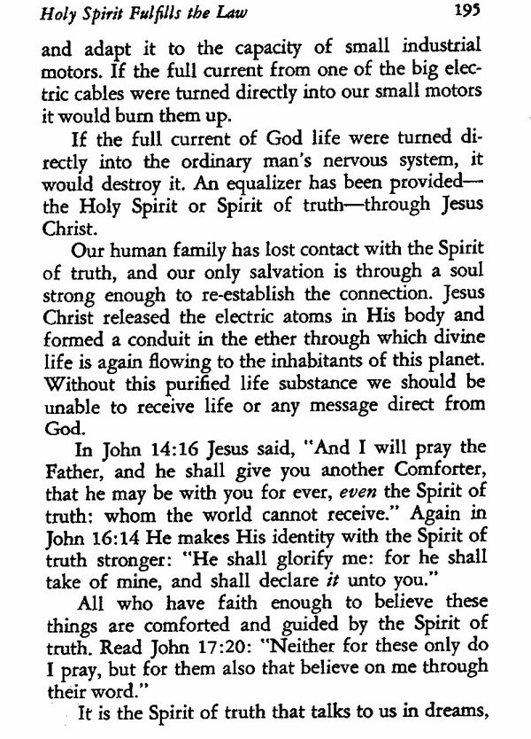 Our human family has lost contact with the Spirit of truth, and our only salvation is through a soul strong enough to re-establish the connection. Jesus Christ released the electric atoms in His body and formed a conduit in the ether through which divine life is again flowing to the inhabitants of this planet. Without this purified life substance we should be unable to receive life or any message direct from God.