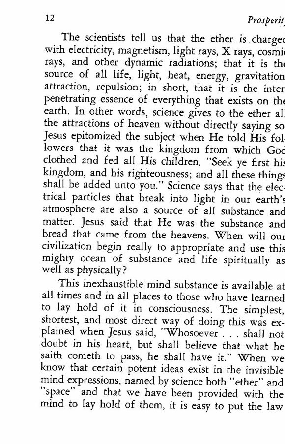 The scientists tell us that the ether is charged with electricity, magnetism, light rays, X rays, cosmic rays, and other dynamic radiations; that it is the source of all life, light, heat, energy, gravitation, attraction, repulsion; in short, that it is the interpenetrating essence of everything that exists on the earth. In other words, science gives to the ether all the attractions of heaven without directly saying so. Jesus epitomized the subject when He told His followers that it was the kingdom from which God clothed and fed all His children. "Seek ye first his kingdom, and his righteousness; and all these things shall be added unto you." Science says that the electrical particles that break into light in our earth's atmosphere are also a source of all substance and matter. Jesus said that He was the substance and bread that came from the heavens. When will our civilization begin really to appropriate and use this mighty ocean of substance and life spiritually as well as physically?