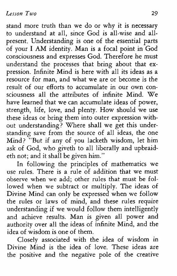 more truth than we do or why it is necessary to understand at all, since God is all-wise and all-present. Understanding is one of the essential parts of your I AM identity. Man is a focal point in God consciousness and expresses God. Therefore he must understand the processes that bring about that expression. Infinite Mind is here with all its ideas as a resource for man, and what we are or become is the result of our efforts to accumulate in our own consciousness all the attributes of infinite Mind. We have learned that we can accumulate ideas of power, strength, life, love, and plenty. How should we use these ideas or bring them into outer expression without understanding? Where shall we get this understanding save from the source of all ideas, the one Mind? "But if any of you lacketh wisdom, let him ask of God, who giveth to all liberally and upbraideth not; and it shall be given him."