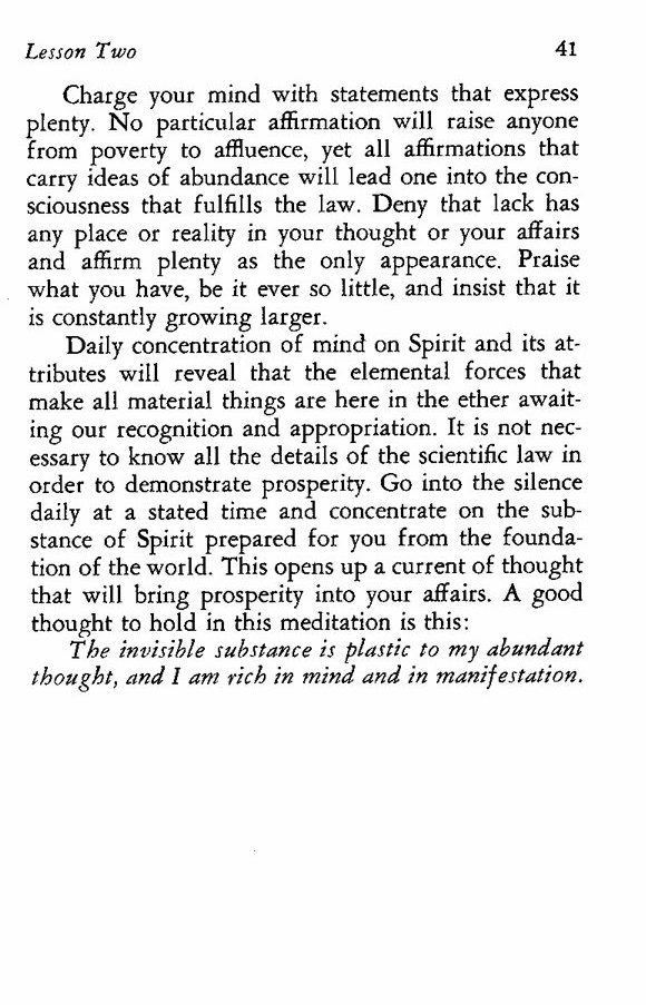 Charge your mind with statements that express plenty. No particular affirmation will raise anyone from poverty to affluence, yet all affirmations that carry ideas of abundance will lead one into the consciousness that fulfills the law. Deny that lack has any place or reality in your thought or your affairs and affirm plenty as the only appearance. Praise what you have, be it ever so little, and insist that it is constantly growing larger.