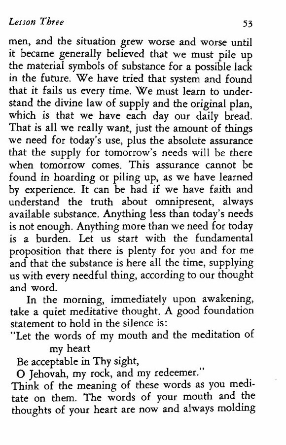 men, and the situation grew worse and worse until it became generally believed that we must pile up the material symbols of substance for a possible lack in the future. We have tried that system and found that it fails us every time. We must learn to understand the divine law of supply and the original plan, which is that we have each day our daily bread. That is all we really want, just the amount of things we need for today's use, plus the absolute assurance that the supply for tomorrow's needs will be there when tomorrow comes. This assurance cannot be found in hoarding or piling up, as we have learned by experience. It can be had if we have faith and understand the truth about omnipresent, always available substance. Anything less than today's needs is not enough. Anything more than we need for today is a burden. Let us start with the fundamental proposition that there is plenty for you and for me and that the substance is here all the time, supplying us with every needful thing, according to our thought and word.