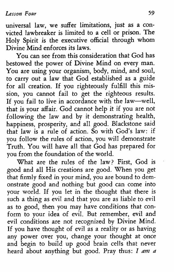 You can see from this consideration that God has bestowed the power of Divine Mind on every man. You are using your organism, body, mind, and soul, to carry out a law that God established as a guide for all creation. If you righteously fulfill this mission, you cannot fail to get the righteous results. If you fail to live in accordance with the law--well, that is your affair. God cannot help it if you are not following the law and by it demonstrating health, happiness, prosperity, and all good. Blackstone said that law is a rule of action. So with God's law: if you follow the rules of action, you will demonstrate Truth. You will have all that God has prepared for you from the foundation of the world.