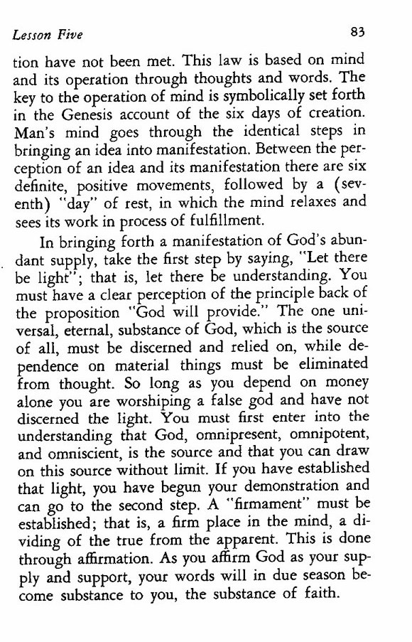 have not been met. This law is based on mind and its operation through thoughts and words. The key to the operation of mind is symbolically set forth in the Genesis account of the six days of creation. Man's mind goes through the identical steps in bringing an idea into manifestation. Between the perception of an idea and its manifestation there are six definite, positive movements, followed by a (seventh) "day" of rest, in which the mind relaxes and sees its work in process of fulfillment.