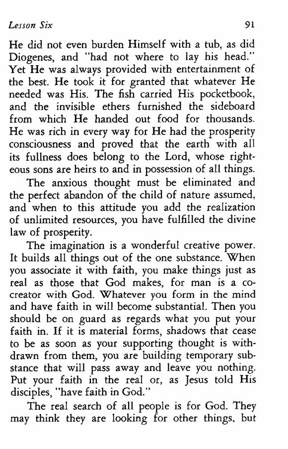 He did not even burden Himself with a tub, as did Diogenes, and "had not where to lay his head." Yet He was always provided with entertainment of the best. He took it for granted that whatever He needed was His. The fish carried His pocketbook, and the invisible ethers furnished the sideboard from which He handed out food for thousands. He was rich in every way for He had the prosperity consciousness and proved that the earth with all its fullness does belong to the Lord, whose righteous sons are heirs to and in possession of all things.