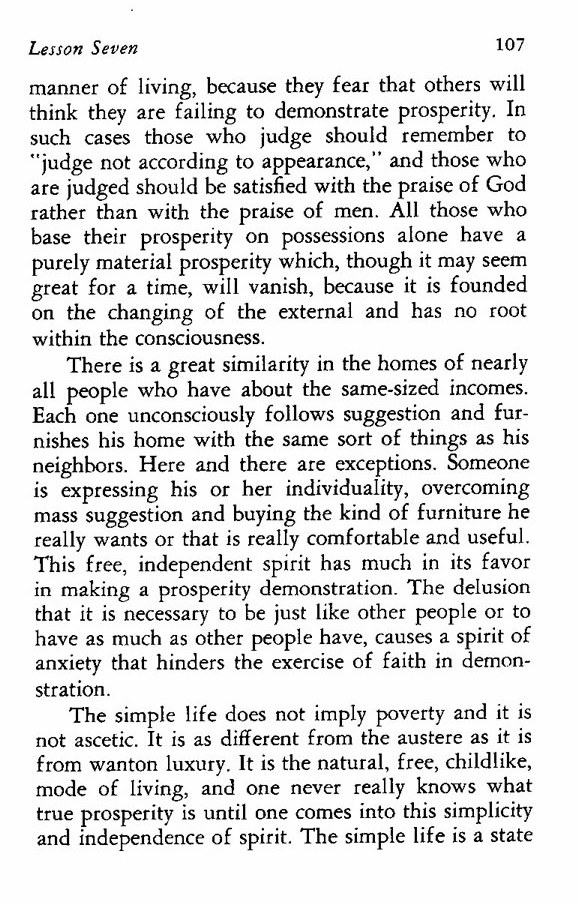 manner of living, because they fear that others will think they are failing to demonstrate prosperity. In such cases those who judge should remember to "judge not according to appearance," and those who are judged should be satisfied with the praise of God rather than with the praise of men. All those who base their prosperity on possessions alone have a purely material prosperity which, though it may seem great for a time, will vanish, because it is founded on the changing of the external and has no root within the consciousness.
