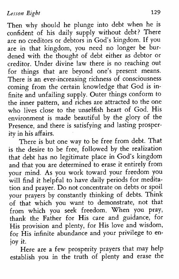 There is but one way to be free from debt. That is the desire to be free, followed by the realization that debt has no legitimate place in God's kingdom and that you are determined to erase it entirely from your mind. As you work toward your freedom you will find it helpful to have daily periods for meditation and prayer. Do not concentrate on debts or spoil your prayers by constantly thinking of debts. Think of that which you want to demonstrate, not that from which you seek freedom. When you pray, thank the Father for His care and guidance, for His provision and plenty, for His love and wisdom, for His infinite abundance and your privilege to enjoy it.