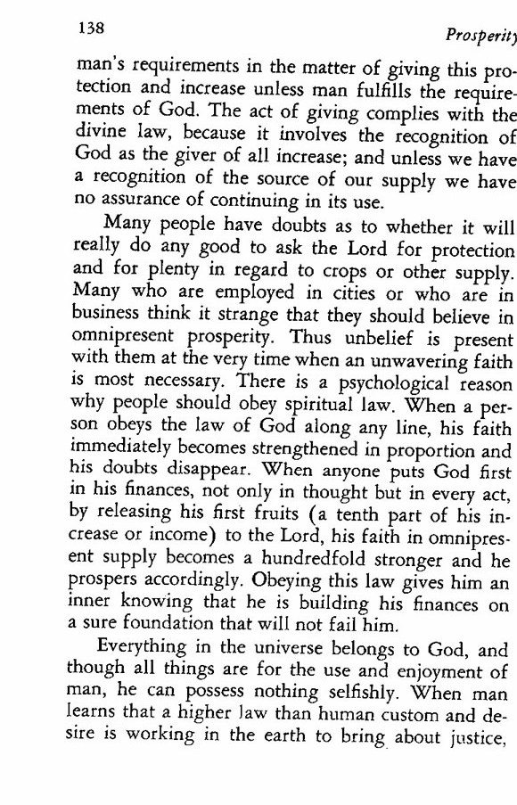 Many people have doubts as to whether it will really do any good to ask the Lord for protection and for plenty in regard to crops or other supply. Many who are employed in cities or who are in business think it strange that they should believe in omnipresent prosperity. Thus unbelief is present with them at the very time when an unwavering faith is most necessary. There is a psychological reason why people should obey spiritual law. When a person obeys the law of God along any line, his faith immediately becomes strengthened in proportion and his doubts disappear. When anyone puts God first in his finances, not only in thought but in every act, by releasing his first fruits (a tenth part of his increase or income) to the Lord, his faith in omnipresent supply becomes a hundredfold stronger and he prospers accordingly. Obeying this law gives him an inner knowing that he is building his finances on a sure foundation that will not fail him.