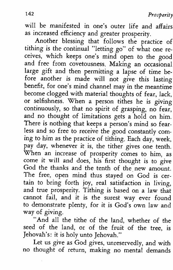 Another blessing that follows the practice of tithing is the continual "letting go" of what one receives, which keeps one's mind open to the good and free from covetousness. Making an occasional large gift and then permitting a lapse of time before another is made will not give this lasting benefit, for one's mind channel may in the meantime become clogged with material thoughts of fear, lack, or selfishness. When a person tithes he is giving continuously, so that no spirit of grasping, no fear, and no thought of limitations gets a hold on him. There is nothing that keeps a person's mind so fearless and so free to receive the good constantly coming to him as the practice of tithing. Each day, week, pay day, whenever it is, the tither gives one tenth. When an increase of prosperity comes to him, as come it will and does, his first thought is to give God the thanks and the tenth of the new amount. The free, open mind thus stayed on God is certain to bring forth joy, real satisfaction in living, and true prosperity. Tithing is based on a law that cannot fail, and it is the surest way ever found to demonstrate plenty, for it is God's own law and way of giving.