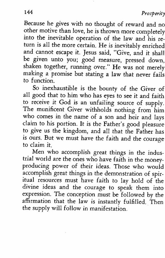 Because he gives with no thought of reward and no other motive than love, he is thrown more completely into the inevitable operation of the law and his return is all the more certain. He is inevitably enriched and cannot escape it. Jesus said, "Give, and it shall be given unto you; good measure, pressed down, shaken together, running over." He was not merely making a promise but stating a law that never fails to function.