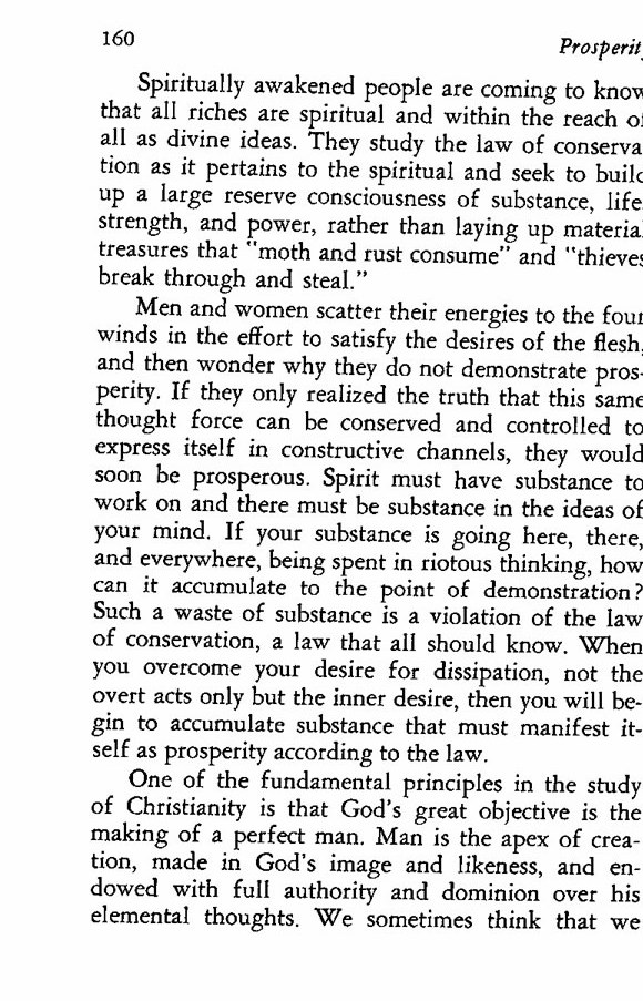 Men and women scatter their energies to the four winds in the effort to satisfy the desires of the flesh, and then wonder why they do not demonstrate prosperity. If they only realized the truth that this same thought force can be conserved and controlled to express itself in constructive channels, they would soon be prosperous. Spirit must have substance to work on and there must be substance in the ideas of your mind. If your substance is going here, there, and everywhere, being spent in riotous thinking, how can it accumulate to the point of demonstration? Such a waste of substance is a violation of the law of conservation, a law that all should know. When you overcome your desire for dissipation, not the overt acts only but the inner desire, then you will begin to accumulate substance that must manifest itself as prosperity according to the law.