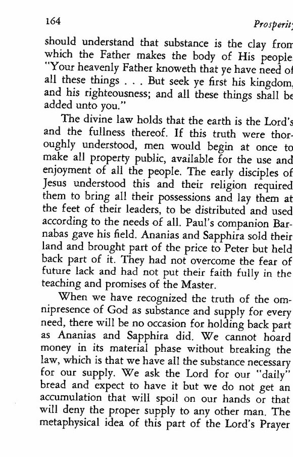 When we have recognized the truth of the omnipresence of God as substance and supply for every need, there will be no occasion for holding back part as Ananias and Sapphira did. We cannot hoard money in its material phase without breaking the law, which is that we have all the substance necessary for our supply. We ask the Lord for our "daily" bread and expect to have it but we do not get an accumulation that will spoil on our hands or that will deny the proper supply to any other man. The metaphysical idea of this part of the Lord's Prayer