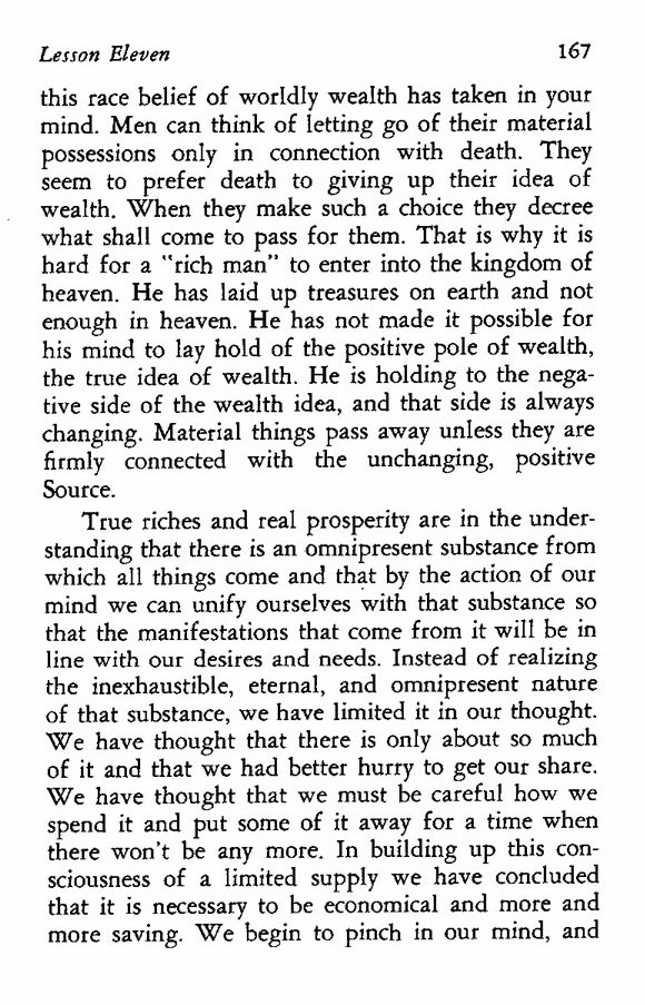 this race belief of worldly wealth has taken in your mind. Men can think of letting go of their material possessions only in connection with death. They seem to prefer death to giving up their idea of wealth. When they make such a choice they decree what shall come to pass for them. That is why it is hard for a "rich man" to enter into the kingdom of heaven. He has laid up treasures on earth and not enough in heaven. He has not made it possible for his mind to lay hold of the positive pole of wealth, the true idea of wealth. He is holding to the negative side of the wealth idea, and that side is always changing. Material things pass away unless they are firmly connected with the unchanging, positive Source.