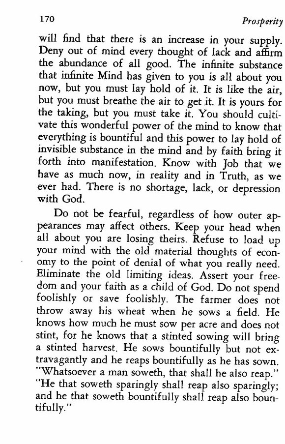 Do not be fearful, regardless of how outer appearances may affect others. Keep your head when all about you are losing theirs. Refuse to load up your mind with the old material thoughts of economy to the point of denial of what you really need. Eliminate the old limiting ideas. Assert your freedom and your faith as a child of God. Do not spend foolishly or save foolishly. The farmer does not throw away his wheat when he sows a field. He knows how much he must sow per acre and does not stint, for he knows that a stinted sowing will bring a stinted harvest. He sows bountifully but not extravagantly and he reaps bountifully as he has sown. "Whatsoever a man soweth, that shall he also reap." "He that soweth sparingly shall reap also sparingly; and he that soweth bountifully shall reap also bountifully."