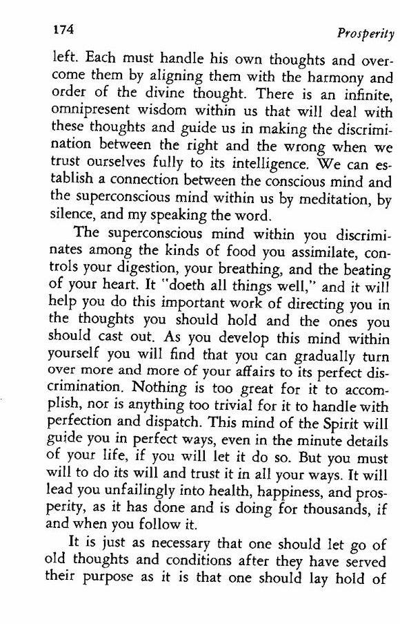 The superconscious mind within you discriminates among the kinds of food you assimilate, controls your digestion, your breathing, and the beating of your heart. It "doeth all things well," and it will help you do this important work of directing you in the thoughts you should hold and the ones you should cast out. As you develop this mind within yourself you will find that you can gradually turn over more and more of your affairs to its perfect discrimination. Nothing is too great for it to accomplish, nor is anything too trivial for it to handle with perfection and dispatch. This mind of the Spirit will guide you in perfect ways, even in the minute details of your life, if you will let it do so. But you must will to do its will and trust it in all your ways. It will lead you unfailingly into health, happiness, and prosperity, as it has done and is doing for thousands, if and when you follow it.