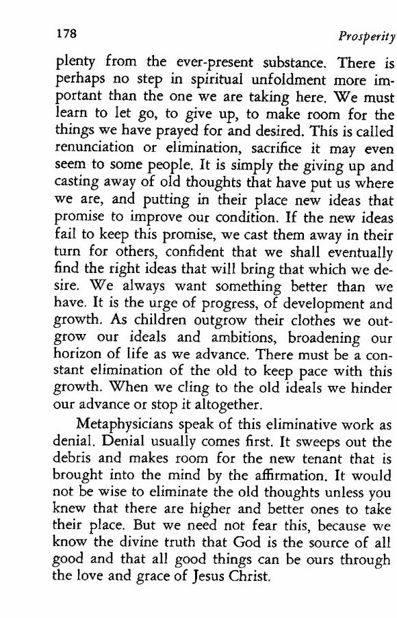 plenty from the ever-present substance. There is perhaps no step in spiritual unfoldment more important than the one we are taking here. We must learn to let go, to give up, to make room for the things we have prayed for and desired. This is called renunciation or elimination, sacrifice it may even seem to some people. It is simply the giving up and casting away of old thoughts that have put us where we are, and putting in their place new ideas that promise to improve our condition. If the new ideas fail to keep this promise, we cast them away in their turn for others, confident that we shall eventually find the right ideas that will bring that which we desire. We always want something better than we have. It is the urge of progress, of development and growth. As children outgrow their clothes we outgrow our ideals and ambitions, broadening our horizon of life as we advance. There must be a constant elimination of the old to keep pace with this growth. When we cling to the old ideals we hinder our advance or stop it altogether.