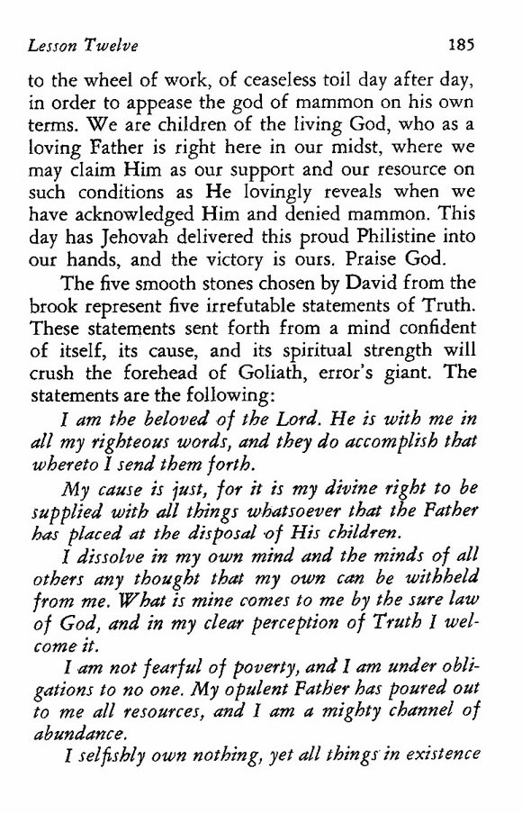 The five smooth stones chosen by David from the brook represent five irrefutable statements of Truth. These statements sent forth from a mind confident of itself, its cause, and its spiritual strength will crush the forehead of Goliath, error's giant. The statements are the following: