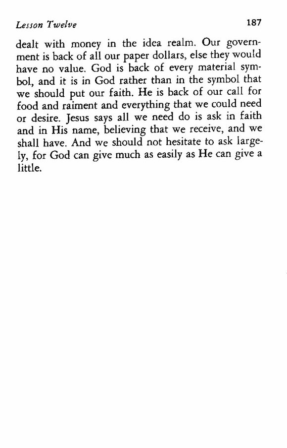 dealt with money in the idea realm. Our government is back of all our paper dollars, else they would have no value. God is back of every material symbol, and it is in God rather than in the symbol that we should put our faith. He is back of our call for food and raiment and everything that we could need or desire. Jesus says all we need do is ask in faith and in His name, believing that we receive, and we shall have. And we should not hesitate to ask largely, for God can give much as easily as He can give a little.