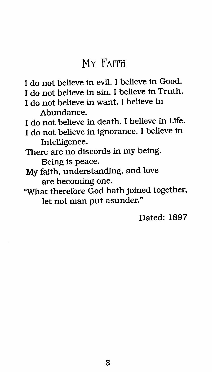Contents - Foreword - My Faith - Purpose of Living - The New Way - Life is a School - Spiritual Science - A Saving Science - Fundamental Propositions - Denial and Affirmation - Embodiment of Thought - Mind Receives - Power of the Word - Meeting The Cloven Hoof - Contentment - Christ Spirit - Spiritual Understanding - Secret Place of Spirit - Overcoming of Fear - Longing of Our Souls - Your Wonderful Body - Spiritual Control - Creature of Habit - Healthy Channel - No Incurable Condition - Health in the Home - Be Made Whole - Health for the Children - Generation and Regeneration - Law of Supply - Prosperity in the Home - Parents and Children - Your Living Service - Gospel of Uses - Justice - Thanksgiving - Christmas - New Year Opportunities - Meditations - Myrtle Fillmore Talks About Her Life - Index