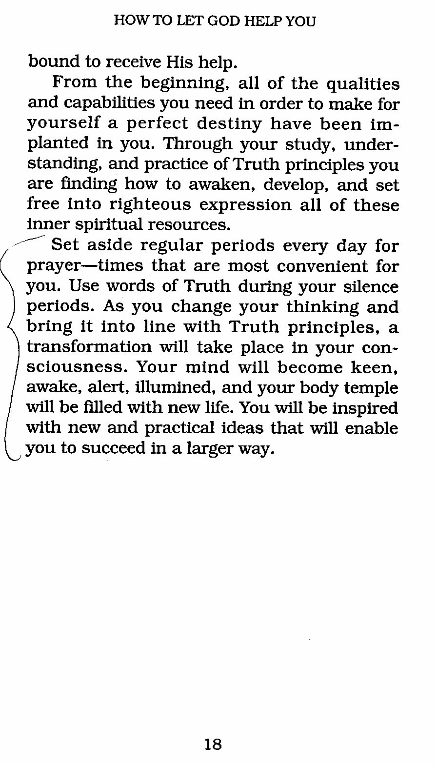 Set aside regular periods every day for prayer --- times that are most convenient for you. Use words of Truth during your silence periods. As you change your thinking and bring it into line with Truth principles, a transformation will take place in your consciousness. Your mind will become keen, awake, alert, illumined, and your body temple will be filled with new life. You will be inspired with new and practical ideas that will enable you to succeed in a larger way.