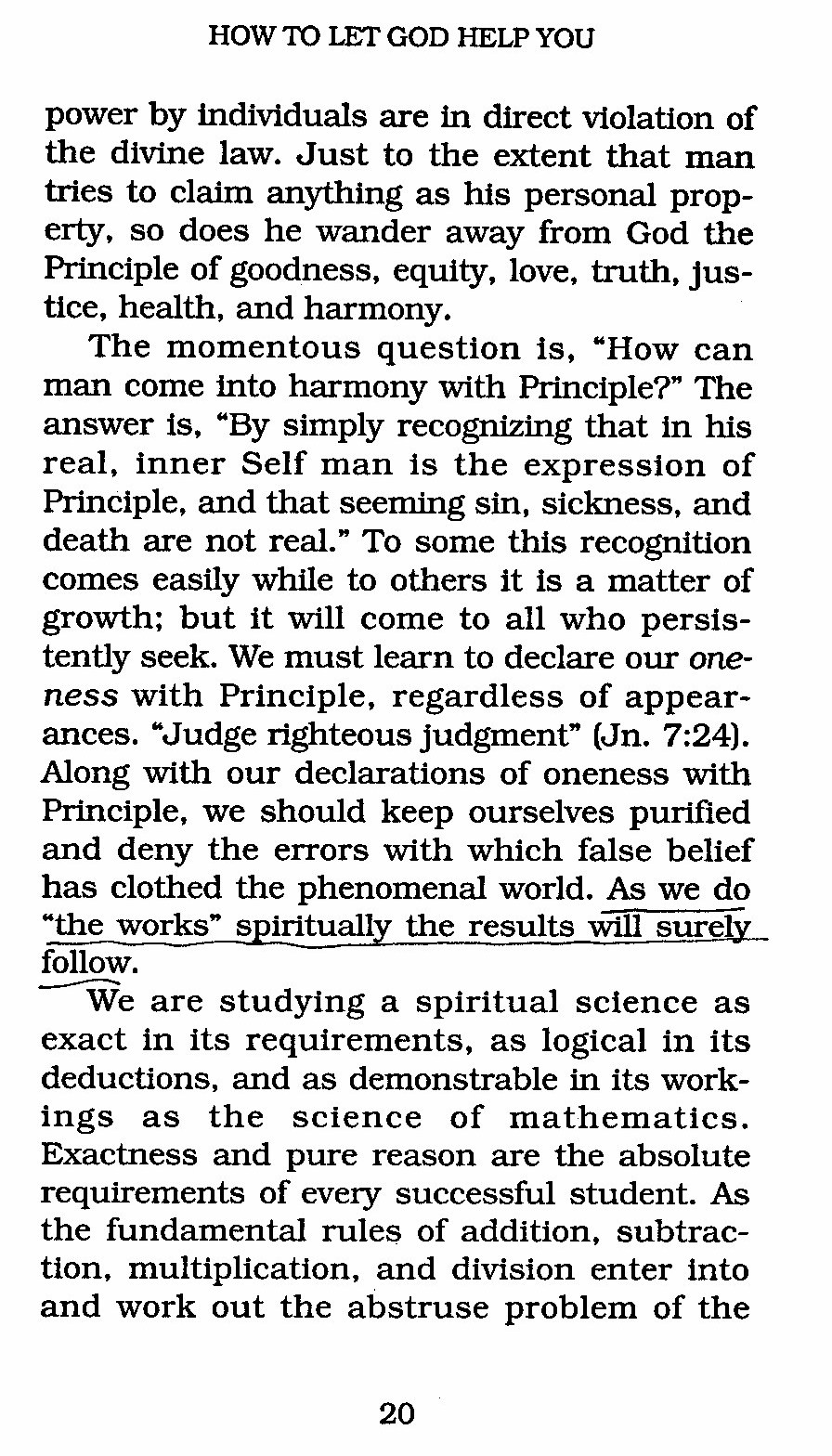The momentous question is, "How can man come into harmony with Principle?" The answer is, "By simply recognizing that in his real, inner Self man is the expression of Principle, and that seeming sin, sickness, and death are not real." To some this recognition comes easily while to others it is a matter of growth; but it will come to all who persistently seek. We must learn to declare our oneness with Principle, regardless of appearances. "Judge righteous judgment" (Jn. 7:24). Along with our declarations of oneness with Principle, we should keep ourselves purified and deny the errors with which false belief has clothed the phenomenal world. As we do "the works" spiritually the results will surely follow.