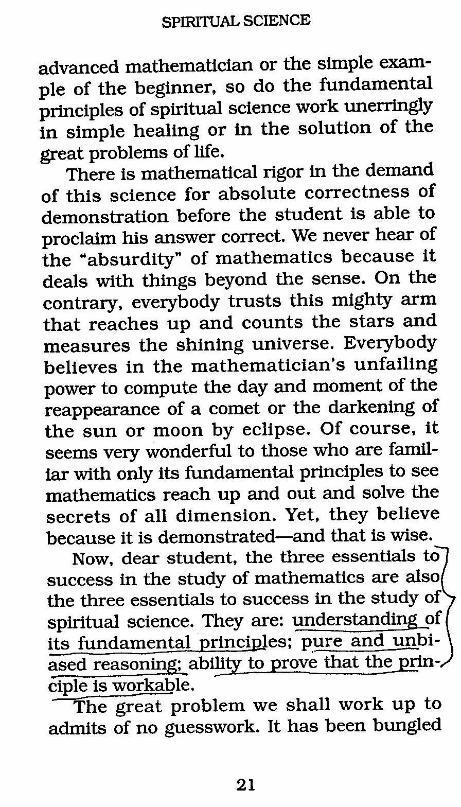 Now, dear student, the three essentials to success in the study of mathematics are also the three essentials to success in the study of spiritual science. They are: understanding of its fundamental principles; pure and unbiased reasoning; ability to prove that the principle is workable.