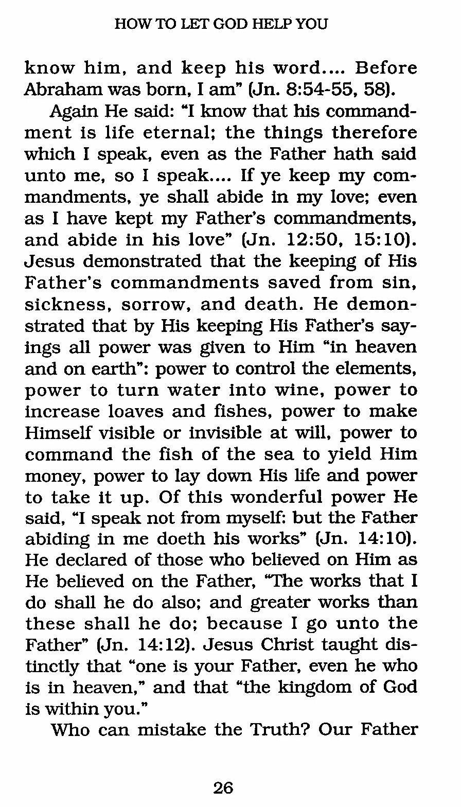Again He said: "I know that his commandment is life eternal; the things therefore which I speak, even as the Father bath said unto me, so I speak.... If ye keep my commandments, ye shall abide in my love; even as I have kept my Father's commandments, and abide in his love" (Jn. 12:50, 15:10). Jesus demonstrated that the keeping of His Father's commandments saved from sin, sickness, sorrow, and death. He demonstrated that by His keeping His Father's sayings all power was given to Him "in heaven and on earth": power to control the elements, power to turn water into wine, power to increase loaves and fishes, power to make Himself visible or invisible at will, power to command the fish of the sea to yield Him money, power to lay down His life and power to take it up. Of this wonderful power He said, "I speak not from myself: but the Father abiding in me doeth his works" (Jn. 14:10). He declared of those who believed on Him as He believed on the Father, "The works that I do shall he do also; and greater works than these shall he do; because I go unto the Father" (Jn. 14:12). Jesus Christ taught distinctly that "one is your Father, even he who is in heaven," and that "the kingdom of God is within you."