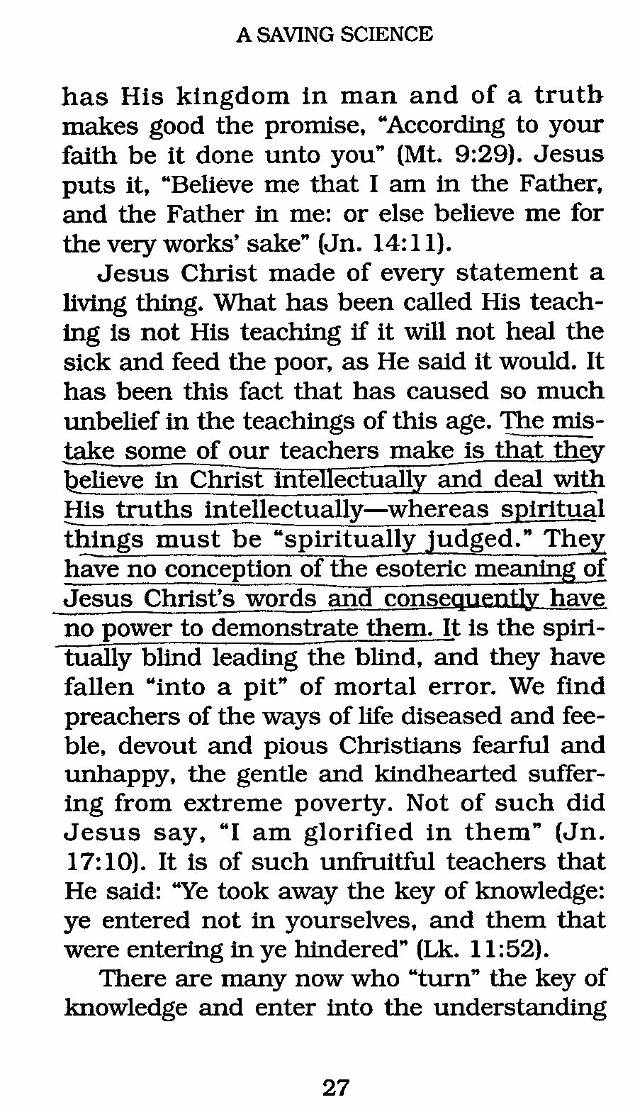 Jesus Christ made of every statement a living thing. What has been called His teaching is not His teaching if it will not heal the sick and feed the poor, as He said it would. It has been this fact that has caused so much unbelief in the teachings of this age. The mistake some of our teachers make is that the believe in Christ intellectually and deal with His truths intellectually --- whereas spiritual things must be "spiritually judged." They have no conception of the esoteric meaning of Jesus Christ's words and consequently have no power to demonstrate them. It is the spiritually blind leading the blind, and they have fallen "into a pit" of mortal error. We find preachers of the ways of life diseased and feeble, devout and pious Christians fearful and unhappy, the gentle and kindhearted suffering from extreme poverty. Not of such did Jesus say, "I am glorified in them" (Jn. 17:10). It is of such unfruitful teachers that He said: "Ye took away the key of knowledge: ye entered not in yourselves, and them that were entering in ye hindered" (Lk. 11:52).