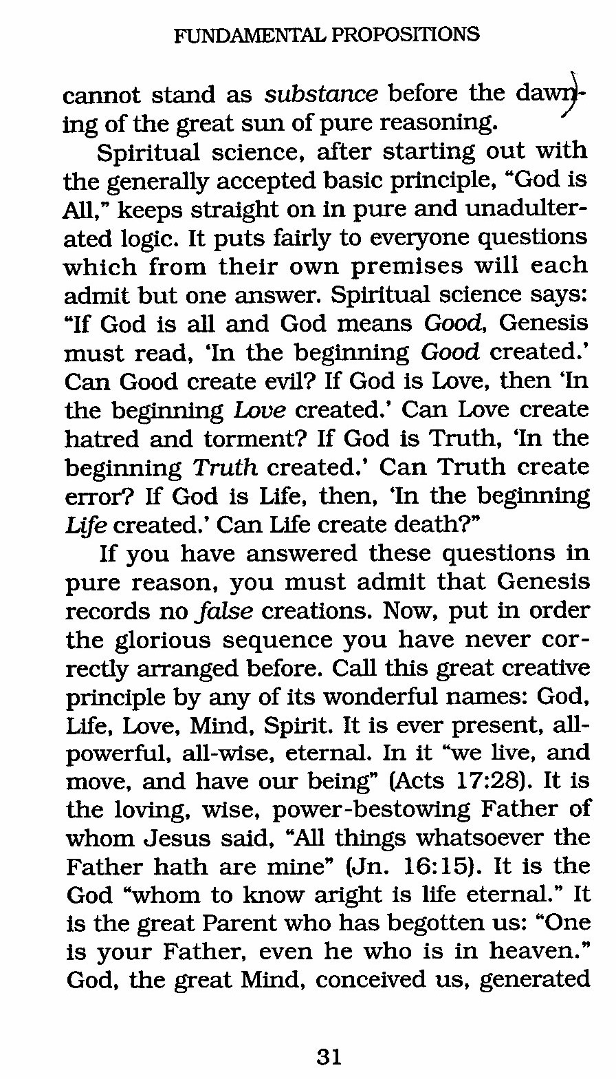 If you have answered these questions in pure reason, you must admit that Genesis records no false creations. Now, put in order the glorious sequence you have never correctly arranged before. Call this great creative principle by any of its wonderful names: God, Life, Love, Mind, Spirit. It is ever present, all-powerful, all-wise, eternal. In it "we live, and move, and have our being" (Acts 17:28). It is the loving, wise, power-bestowing Father of whom Jesus said, "All things whatsoever the Father hath are mine" (Jn. 16:15). It is the God "whom to know aright is life eternal." It is the great Parent who has begotten us: "One is your Father, even he who is in heaven." God, the great Mind, conceived us, generated