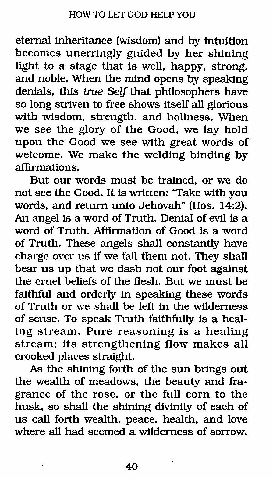 But our words must be trained, or we do not see the Good. It is written: "Take with you words, and return unto Jehovah" (Hos. 14:2). An angel is a word of Truth. Denial of evil is a word of Truth. Affirmation of Good is a word of Truth. These angels shall constantly have charge over us if we fail them not. They shall bear us up that we dash not our foot against the cruel beliefs of the flesh. But we must be faithful and orderly in speaking these words of Truth or we shall be left in the wilderness of sense. To speak Truth faithfully is a healing stream. Pure reasoning is a healing stream; its strengthening flow makes all crooked places straight.