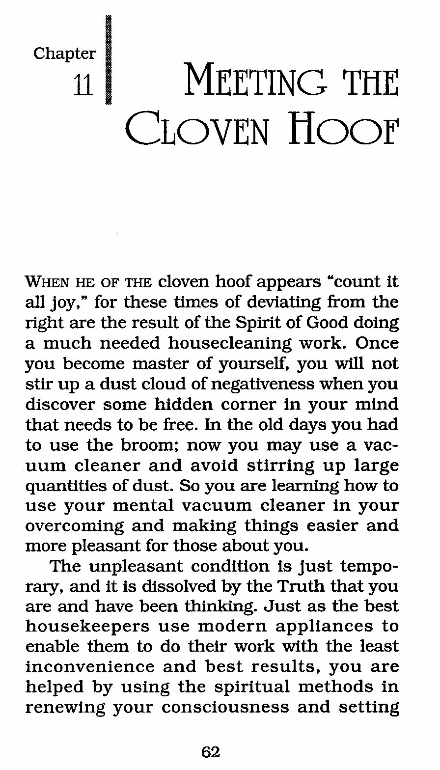 WHEN HE OF THE cloven hoof appears "count it all joy," for these times of deviating from the right are the result of the Spirit of Good doing a much needed housecleaning work. Once you become master of yourself, you will not stir up a dust cloud of negativeness when you discover some hidden corner in your mind that needs to be free. In the old days you had to use the broom; now you may use a vacuum cleaner and avoid stirring up large quantities of dust. So you are learning how to use your mental vacuum cleaner in your overcoming and making things easier and more pleasant for those about you.