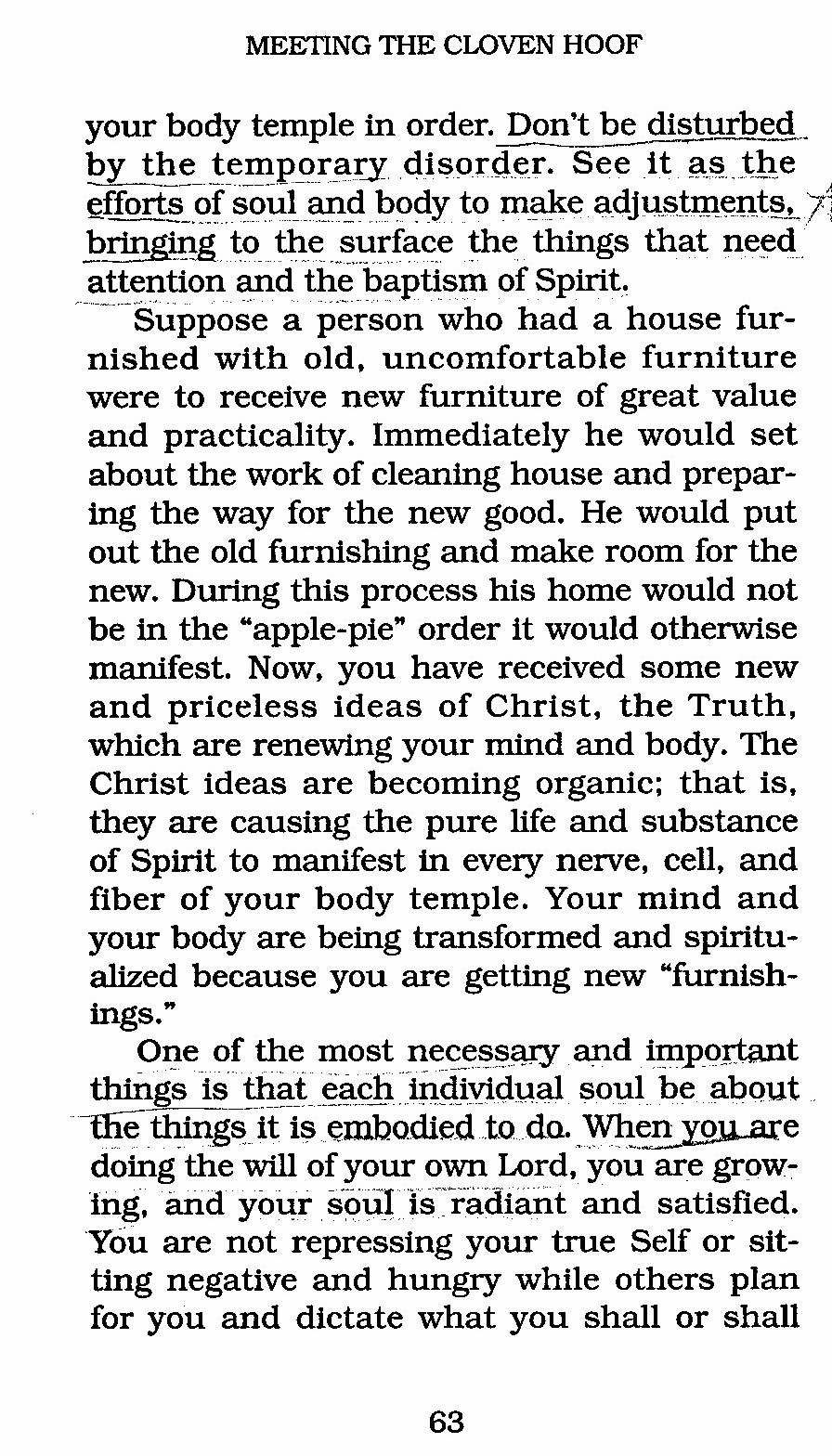 Suppose a person who had a house furnished with old, uncomfortable furniture were to receive new furniture of great value and practicality. Immediately he would set about the work of cleaning house and preparing the way for the new good. He would put out the old furnishing and make room for the new. During this process his home would not be in the "apple-pie" order it would otherwise manifest. Now, you have received some new and priceless ideas of Christ, the Truth, which are renewing your mind and body. The Christ ideas are becoming organic; that is, they are causing the pure life and substance of Spirit to manifest in every nerve, cell, and fiber of your body temple. Your mind and your body are being transformed and spiritualized because you are getting new "furnishings."