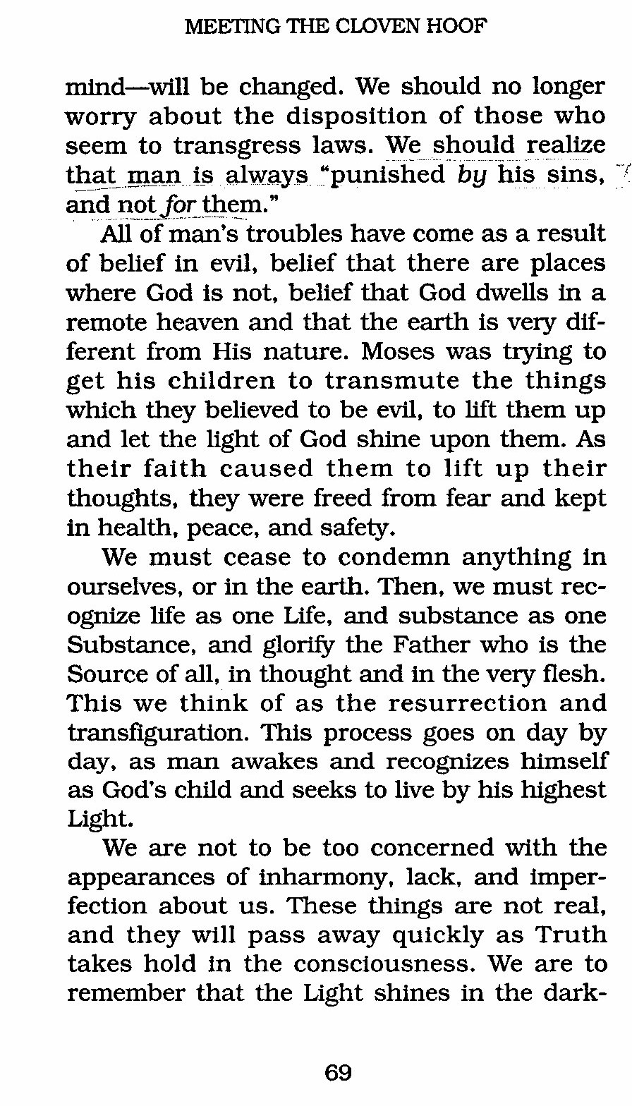 We are not to be too concerned with the appearances of inharmony, lack, and imperfection about us. These things are not real, and they will pass away quickly as Truth takes hold in the consciousness. We are to remember that the Light shines in the darkness ---