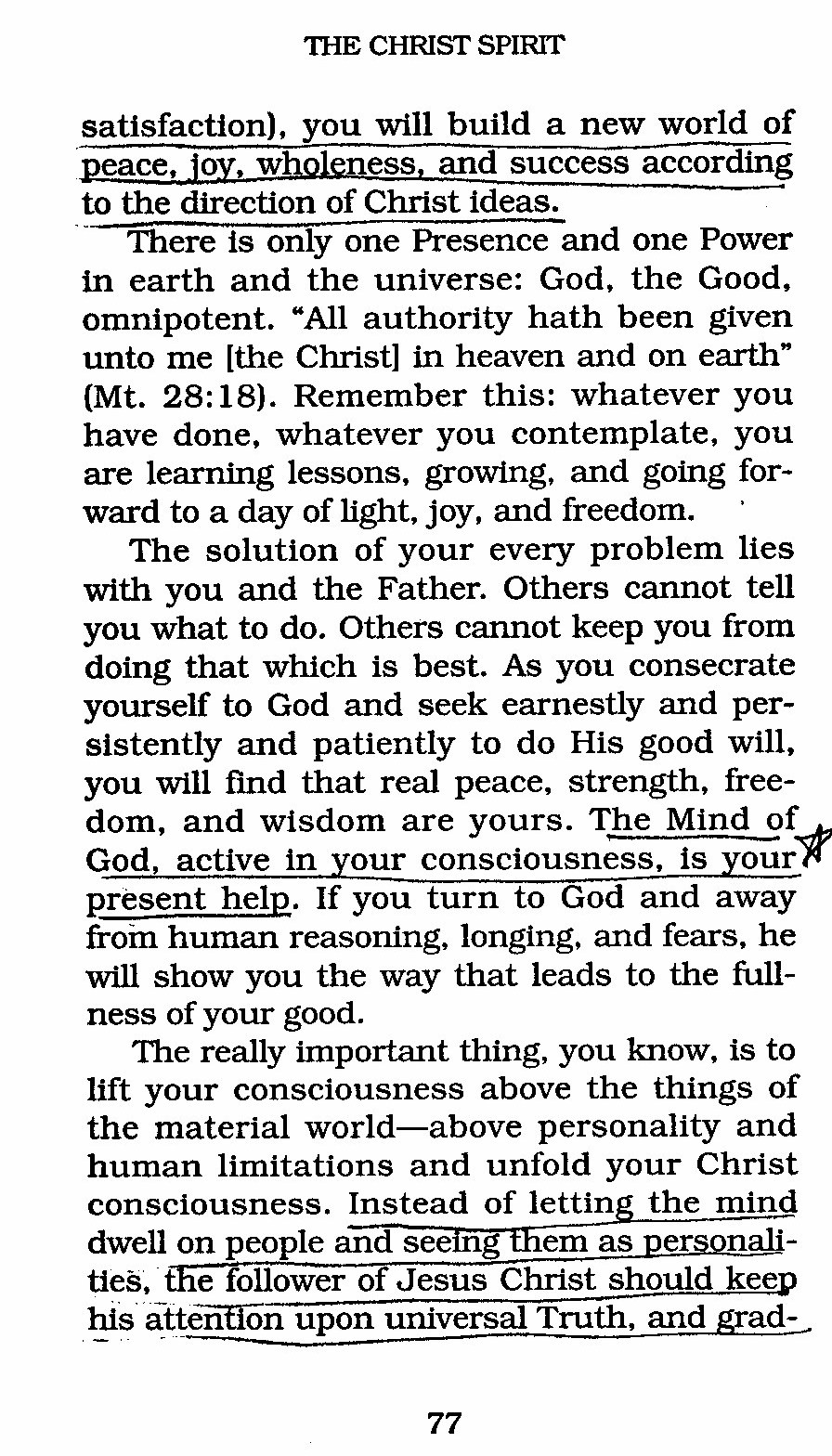 The really important thing, you know, is to lift your consciousness above the things of the material world --- above personality and human limitations and unfold your Christ consciousness. Instead of letting, the mind dwell on people and seeing them as personalities, the follower of Jesus Christ should keep his attention upon universal Truth, and gradually