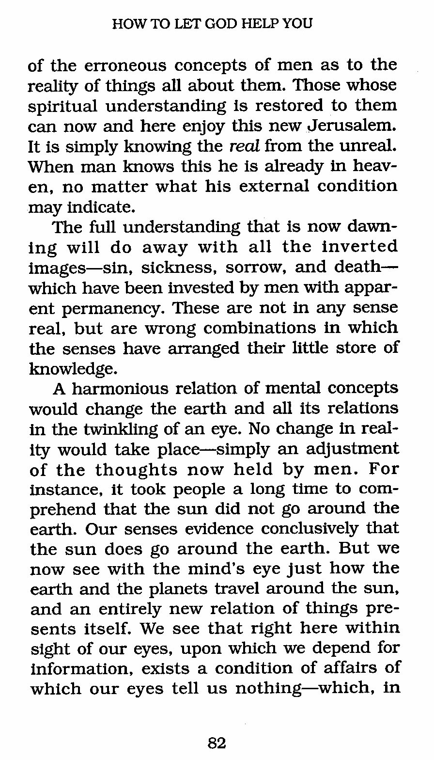 A harmonious relation of mental concepts would change the earth and all its relations in the twinkling of an eye. No change in reality would take place --- simply an adjustment of the thoughts now held by men. For instance, it took people a long time to comprehend that the sun did not go around the earth. Our senses evidence conclusively that the sun does go around the earth. But we now see with the mind's eye just how the earth and the planets travel around the sun, and an entirely new relation of things presents itself. We see that right here within sight of our eyes, upon which we depend for information, exists a condition of affairs of which our eyes tell us nothing --- which, in