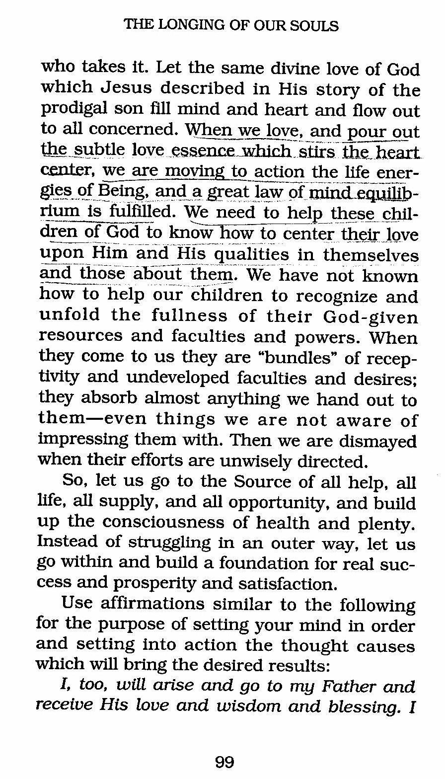 who takes it. Let the same divine love of God which Jesus described in His story of the prodigal son fill mind and heart and flow out to all concerned. When we love, and pour out the subtle love essence which, stirs the heart center, we are moving to action the life energies of Being, and a great law of mind equilibrium is fulfilled. We need to help these children of God to know how to center their love upon Him and His qualities in themselves and those about them. We have not known how to help our children to recognize and unfold the fullness of their God-given resources and faculties and powers. When they come to us they are "bundles" of receptivity and undeveloped faculties and desires; they absorb almost anything we hand out to them --- even things we are not aware of impressing them with. Then we are dismayed when their efforts are unwisely directed.