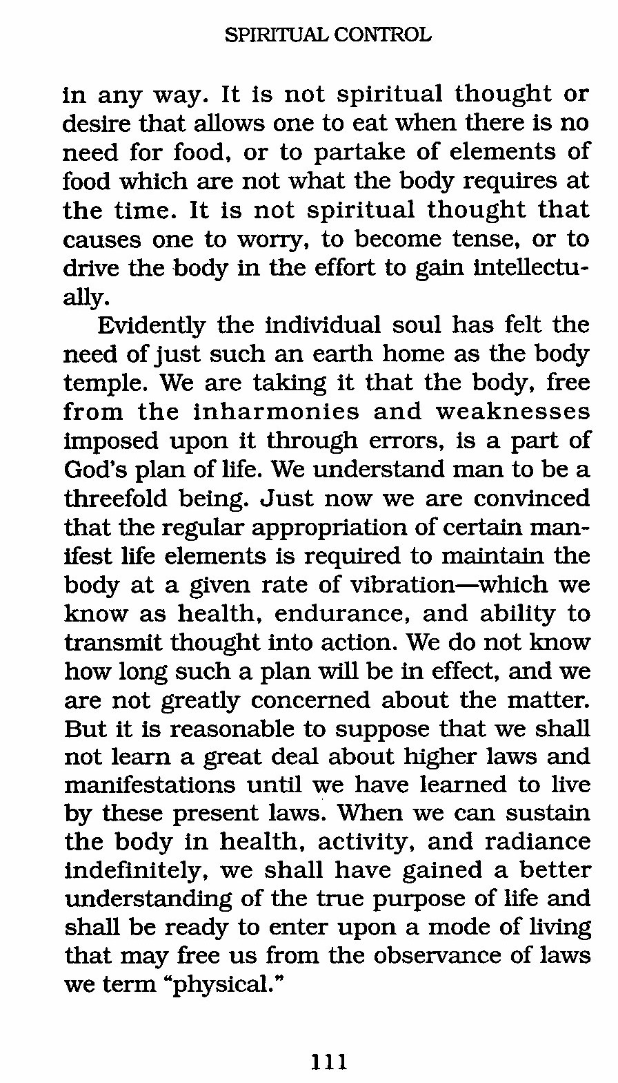 Evidently the individual soul has felt the need of just such an earth home as the body temple. We are taking it that the body, free from the in harmonies and weaknesses imposed upon it through errors, is a part of God's plan of life. We understand man to be a threefold being. Just now we are convinced that the regular appropriation of certain manifest life elements is required to maintain the body at a given rate of vibration --- which we know as health, endurance, and ability to transmit thought into action. We do not know how long such a plan will be in effect, and we are not greatly concerned about the matter. But it is reasonable to suppose that we shall not learn a great deal about higher laws and manifestations until we have learned to live by these present laws. When we can sustain the body in health, activity, and radiance indefinitely, we shall have gained a better understanding of the true purpose of life and shall be ready to enter upon a mode of living that may free us from the observance of laws we term "physical."