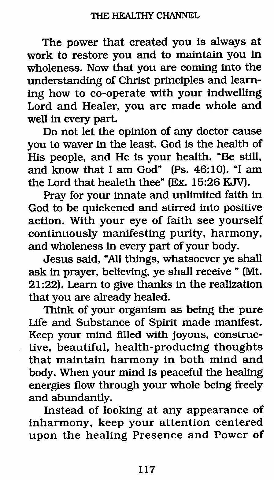The power that created you is always at work to restore you and to maintain you in wholeness. Now that you are corning into the understanding of Christ principles and learning how to co-operate with your indwelling Lord and Healer, you are made whole and well in every part.