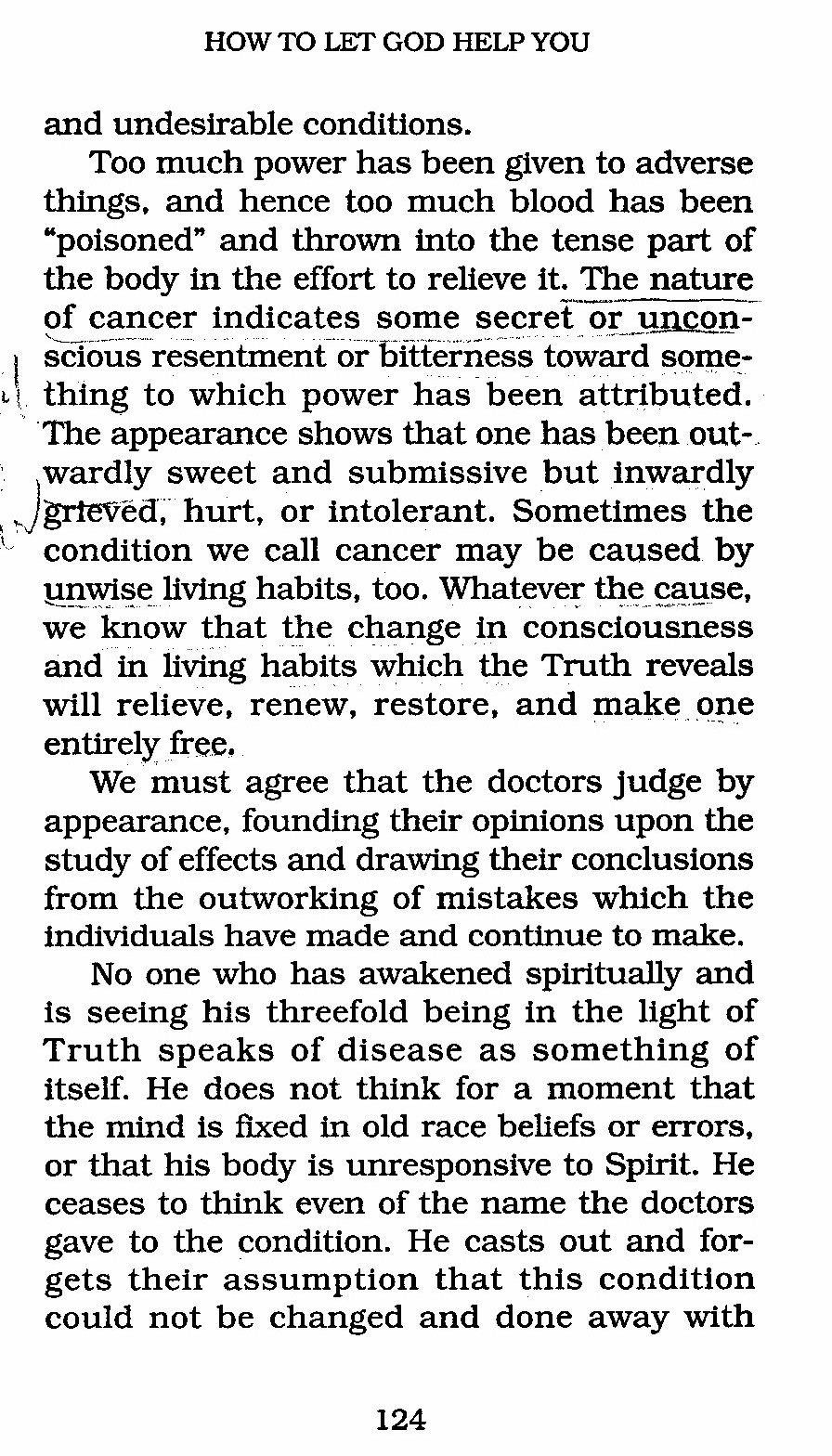Too much power has been given to adverse things, and hence too much blood has been "poisoned" and thrown into the tense part of the body in the effort to relieve it. The nature of cancer indicates some secret or unconscious resentment or bitterness toward something to which power has been attributed. The appearance shows that one has been outwardly sweet and submissive but inwardly grieved, hurt, or intolerant. Sometimes the condition we call cancer may be caused by unwise living habits, too. Whatever the cause, we know that the change in consciousness and in living habits which the Truth reveals will relieve, renew, restore, and make one entirely free.