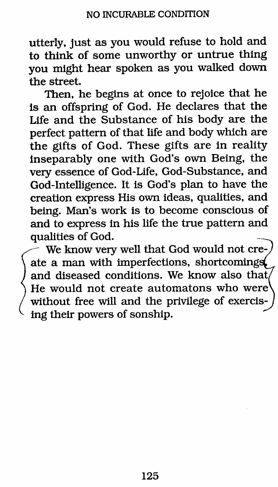 Then, he begins at once to rejoice that he is an offspring of God. He declares that the Life and the Substance of his body are the perfect pattern of that life and body which are the gifts of God. These gifts are in reality inseparably one with God's own Being, the very essence of God-Life, God-Substance, and God-Intelligence. It is God's plan to have the creation express His own ideas, qualities, and being. Man's work is to become conscious of and to express in his life the true pattern and qualities of God.