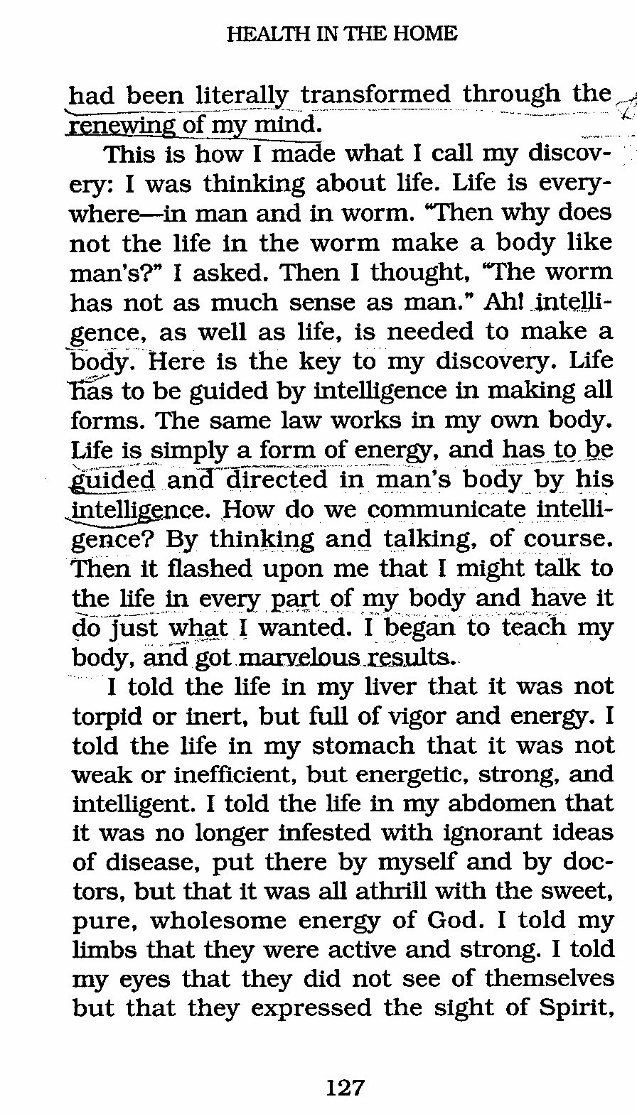 I told the life in my liver that it was not torpid or inert, but full of vigor and energy. I told the life in my stomach that it was not weak or inefficient, but energetic, strong, and intelligent. I told the life in my abdomen that it was no longer infested with ignorant ideas of disease, put there by myself and by doctors, but that it was all athrill with the sweet, pure, wholesome energy of God. I told my limbs that they were active and strong. I told my eyes that they did not see of themselves but that they expressed the sight of Spirit,