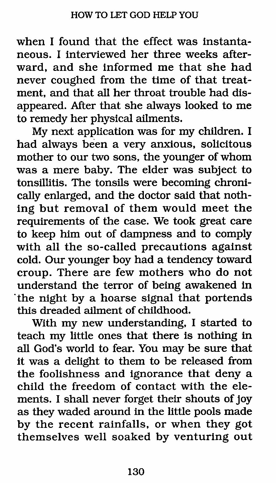 My next application was for my children. I had always been a very anxious, solicitous mother to our two sons, the younger of whom was a mere baby. The elder was subject to tonsillitis. The tonsils were becoming chronically enlarged, and the doctor said that nothing but removal of them would meet the requirements of the case. We took great care to keep him out of dampness and to comply with all the so-called precautions against cold. Our younger boy had a tendency toward croup. There are few mothers who do not understand the terror of being awakened in the night by a hoarse signal that portends this dreaded ailment of childhood.