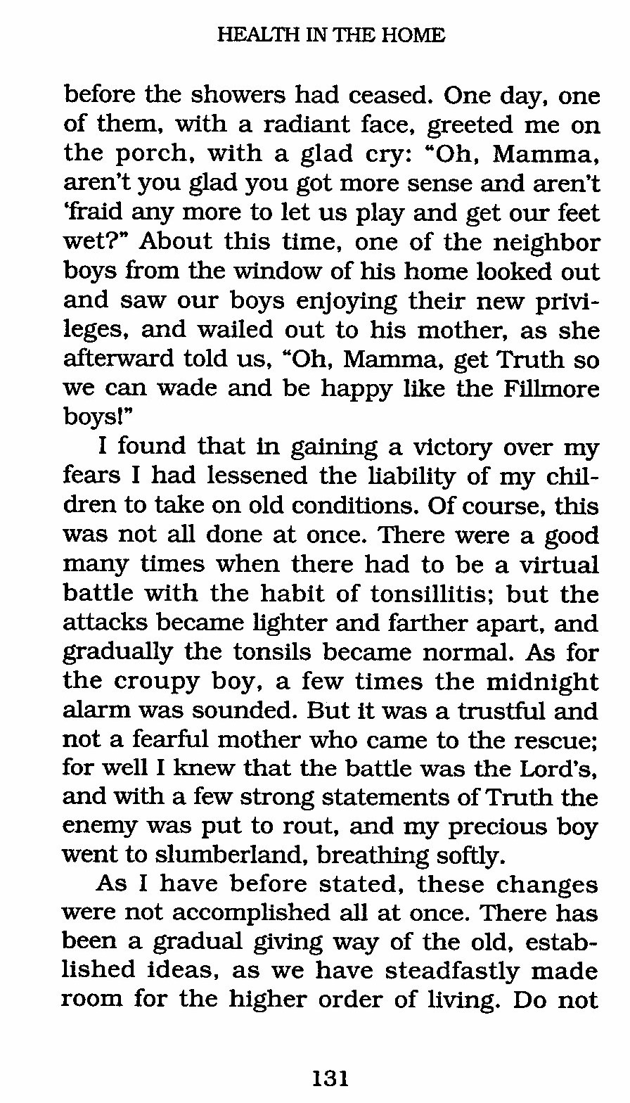 I found that in gaining a victory over my fears I had lessened the liability of my children to take on old conditions. Of course, this was not all done at once. There were a good many times when there had to be a virtual battle with the habit of tonsillitis; but the attacks became lighter and farther apart, and gradually the tonsils became normal. As for the croupy boy, a few times the midnight alarm was sounded. But it was a trustful and not a fearful mother who came to the rescue; for well I knew that the battle was the Lord's, and with a few strong statements of Truth the enemy was put to rout, and my precious boy went to slumberland, breathing softly.