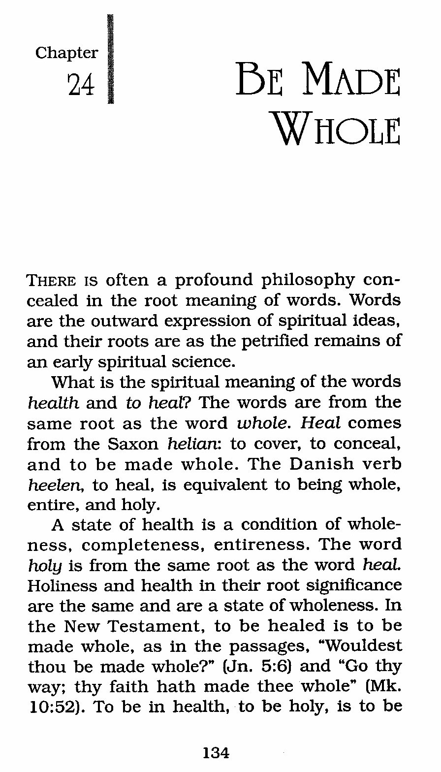 A state of health is a condition of wholeness, completeness, entireness. The word holy is from the same root as the word heal. Holiness and health in their root significance are the same and are a state of wholeness. In the New Testament, to be healed is to be made whole, as in the passages, "Wouldest thou be made whole?" (Jn. 5:6) and "Go thy way; thy faith hath made thee whole" (Mk. 10:52). To be in health, to be holy, is to be