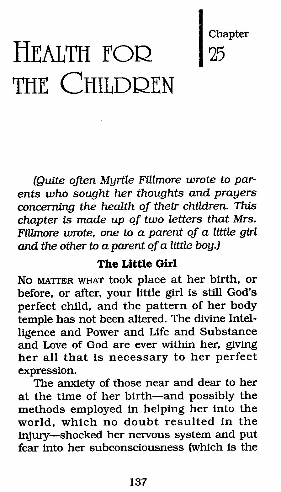 (Quite often Myrtle Fillmore wrote to parents who sought her thoughts and prayers concerning the health of their children. This chapter is made up of two letters that Mrs. Fillmore wrote, one to a parent of a little girl and the other to a parent of a little boy.)