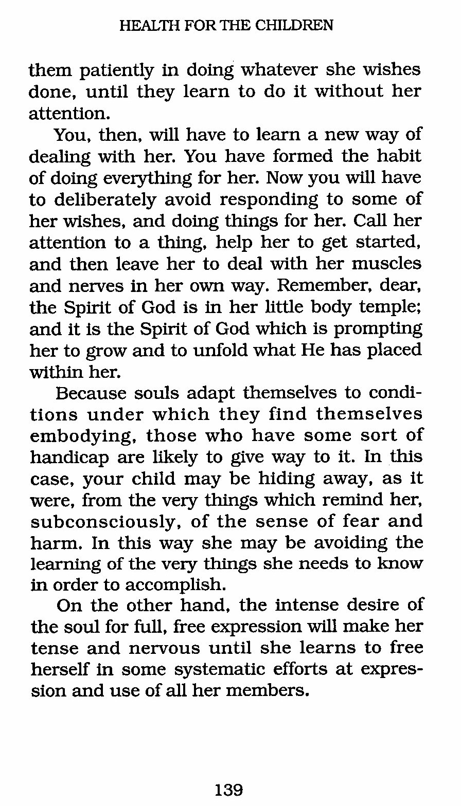 You, then, will have to learn a new way of dealing with her. You have formed the habit of doing everything for her. Now you will have to deliberately avoid responding to some of her wishes, and doing things for her. Call her attention to a thing, help her to get started, and then leave her to deal with her muscles and nerves in her own way. Remember, dear, the Spirit of God is in her little body temple; and it is the Spirit of God which is prompting her to grow and to unfold what He has placed within her.