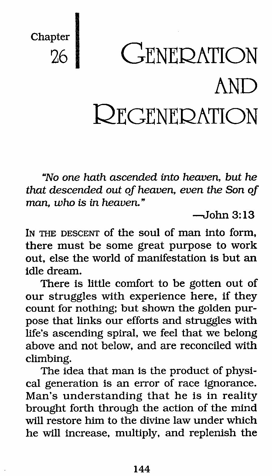 The idea that man is the product of physical generation is an error of race ignorance. Man's understanding that he is in reality brought forth through the action of the mind will restore him to the divine law under which he will increase, multiply, and replenish the